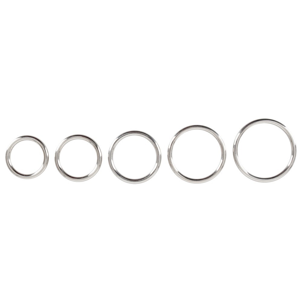 Set di anelli per pene e scroto in 5 pezzi Professional di Bad Kitty per prestazioni maschili forti e una vista eccitante. Gli anelli senza saldatura sono realizzati in acciaio al carbonio lucidato a specchio e hanno diametri diversi. Possono essere raffreddati o riscaldati per giochi di temperatura fantasiosi.