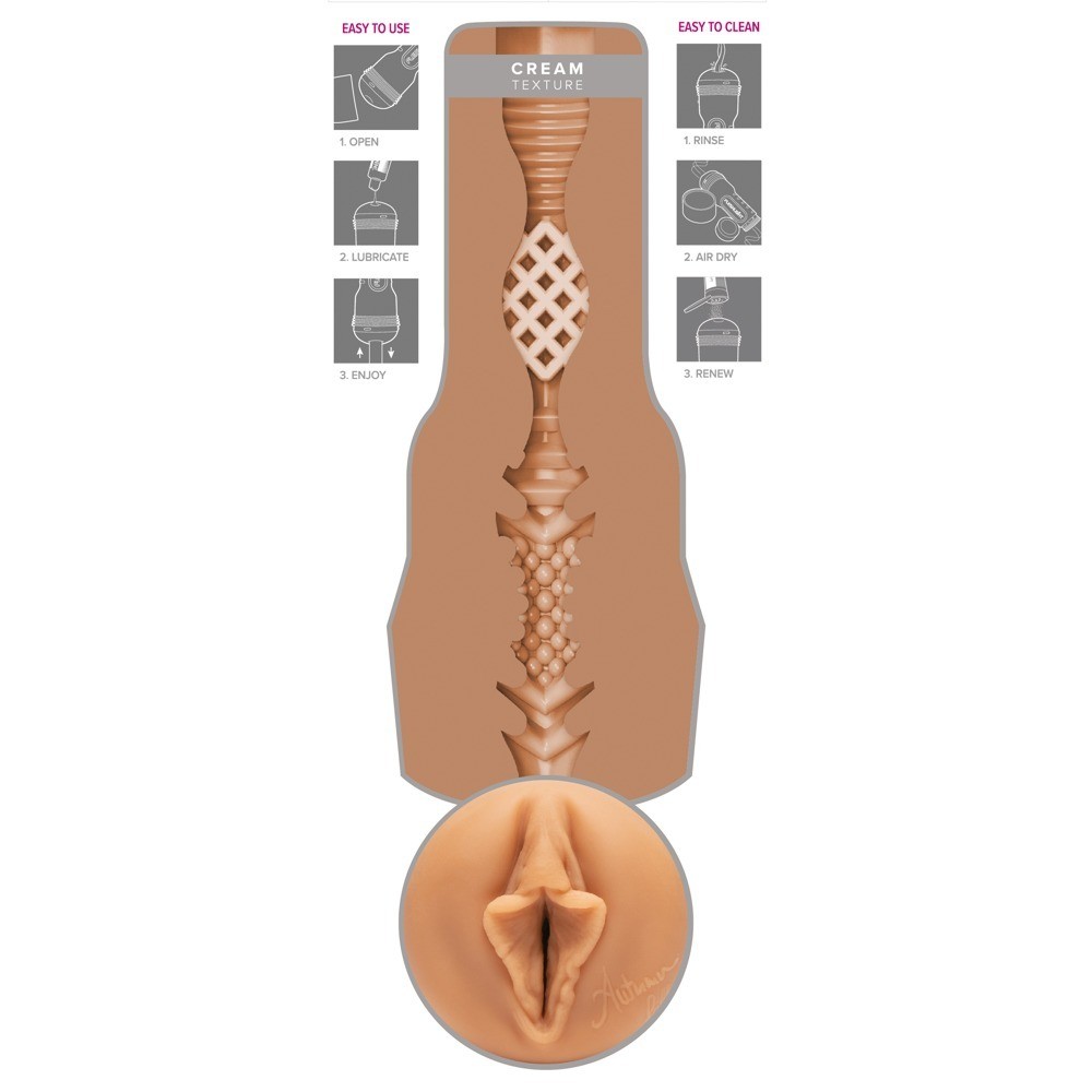 Masturbatore facile da tenere in mano Autumn Falls Cream di Fleshlight in una discreta custodia perlescente. Il foro della vagina della custodia è una replica originale della vagina della star erotica Autumn Fall. Le varie texture con diametri diversi all'interno del canale del piacere assomigliano molto alla vagina stretta di Autumn e sono perfette per un massaggio intenso e orgasmico durante una sega. La guaina interna è realizzata in materiale molto morbido, simile alla pelle. Accanto al foro c'è anche la firma di Autumn. La custodia ha anche un coperchio protettivo. Il manicotto può essere rimosso dalla custodia per la pulizia.