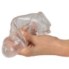 La guaina trasparente per il pene con estensione e anello sferico di Crystal Clear presenta venature pronunciate e aiuta il pene a raggiungere la sua forma migliore per momenti di piacere intensi e gratificanti. La guaina di supporto all'erezione si adatta perfettamente al pene eretto ed è realizzata in materiale morbido ed elastico. L'anello sferico integrato si adatta in modo saldo ma confortevole, impedendo alla guaina di scivolare. Il grande diametro esterno e lo spessore del materiale aumentano significativamente la circonferenza del pene. Il glande solido allunga il pene di circa 5 cm.