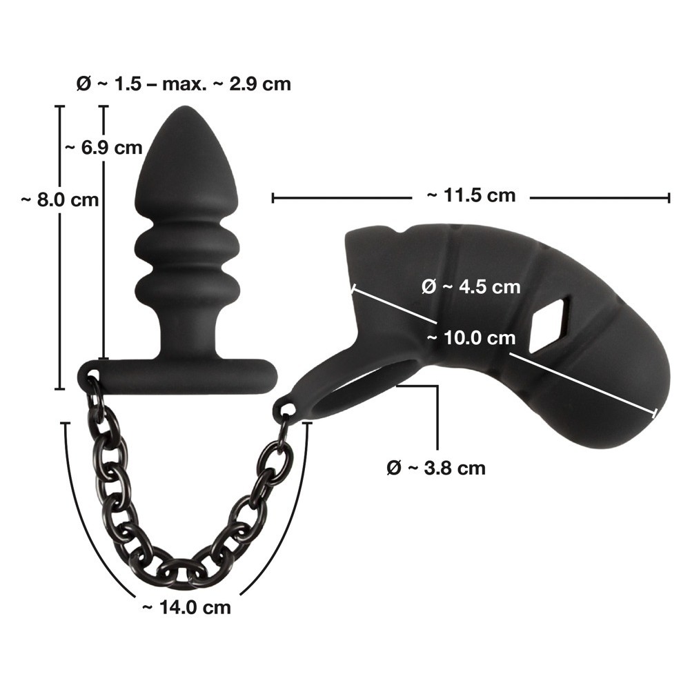 La gabbia per il pene, l'anello sferico e il plug anale sono realizzati in silicone delicato sulla pelle con texture Soft Touch, adattandosi perfettamente all'anatomia e ai movimenti dell'utente. La catena metallica fissa mantiene il plug in posizione, impedendogli di scivolare all'interno. La gabbia è dotata di fessure di ventilazione e di un'apertura sul glande per urinare, aumentando ulteriormente il comfort e il piacere.