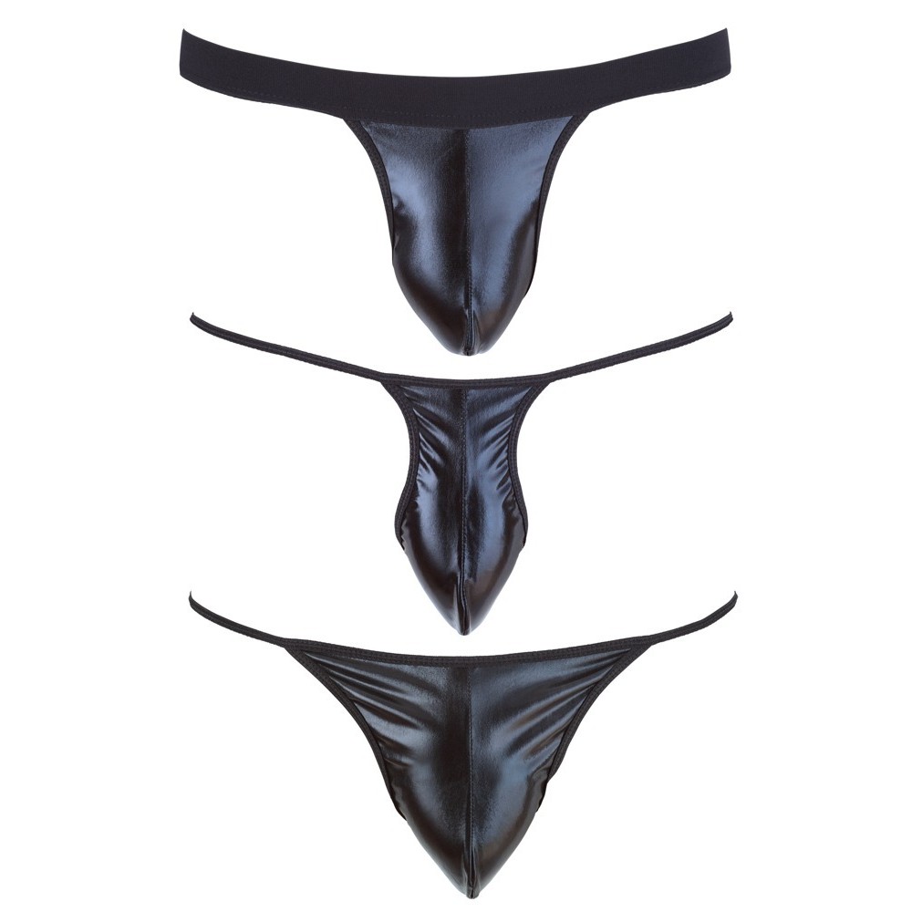 È sempre utile avere questi tre slip nel cassetto della biancheria intima: un mini slip, un mini perizoma e un jockstrap. Sono tutti realizzati in tessuto elastico nero, con una finitura lucida ed effetto bagnato.