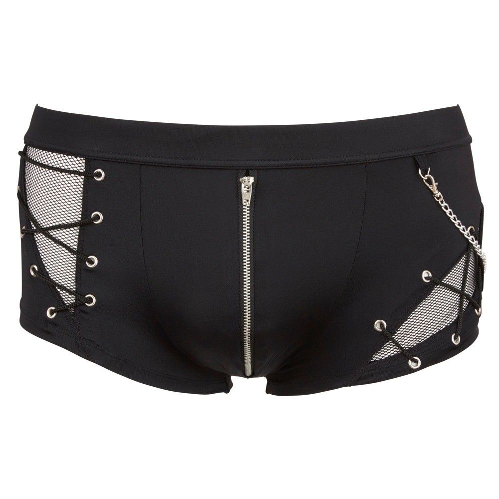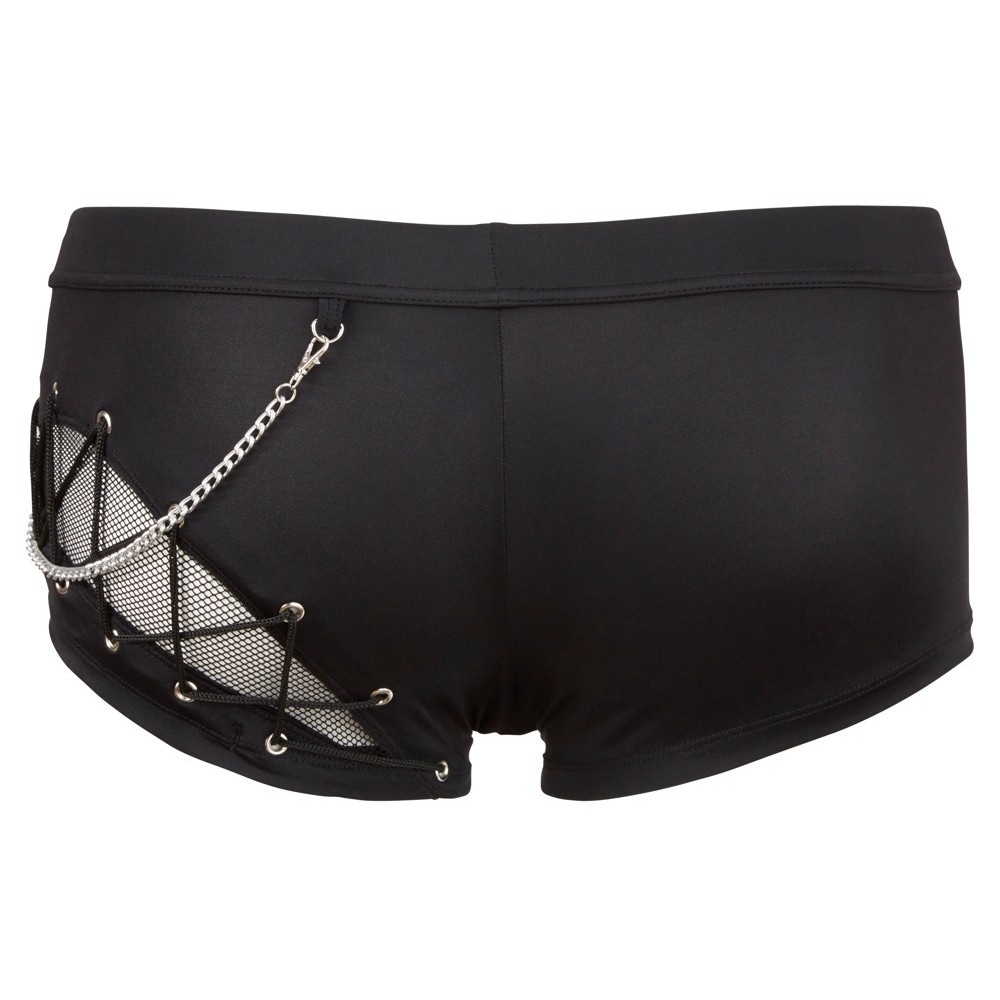 Pantaloncini realizzati con una combinazione moderna di tessuto opaco e trasparente (a rete). Dotati di catena decorativa rimovibile e chiusura a cerniera sul davanti. Di colore nero e altamente elastici per il massimo comfort.