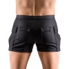Pantaloncini neri e larghi di Svenjoyment, realizzati in tessuto leggermente elasticizzato con finitura opaca. Ispirati allo stile da lavoro, presentano una fila di bottoni a pressione sul davanti, due ampie tasche laterali e due tasche posteriori, tutte con chiusura a pressione.