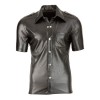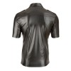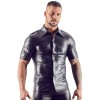 Camicia da uomo in finta pelle nera lucida, leggermente aderente in vita per mettere in risalto i muscoli. Dettagli come la fila di bottoni a pressione, le spalline e la tasca sul petto conferiscono un tocco elegante e sicuro di sé. Ideale da indossare con i jeans o per un look più audace.