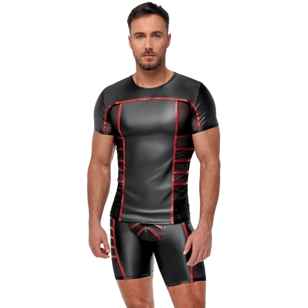 Maglia aderente a maniche corte di NEK, in nero opaco con strisce rosse a contrasto. Presenta inserti in maglia sottile trasparente sui fianchi e sotto le ascelle. Morbida ed elastica su tutta la superficie, garantisce il massimo comfort e un look di grande effetto.