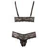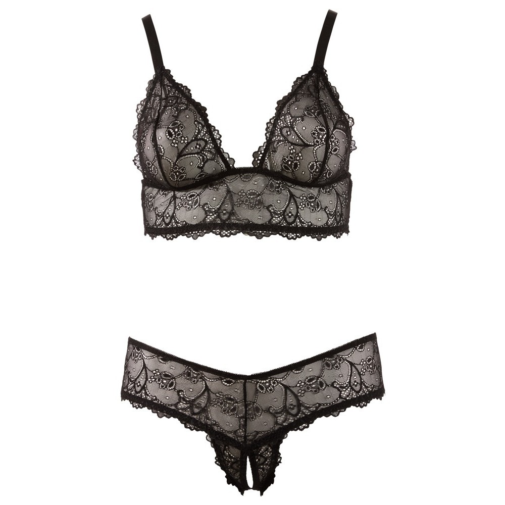 Delicato pizzo nero: reggiseno morbido, senza ferretto e senza chiusura, con spalline regolabili per una vestibilità perfetta. Lo stravagante perizoma, senza cavallo, è ideale per i momenti di passione in coppia.