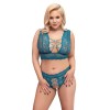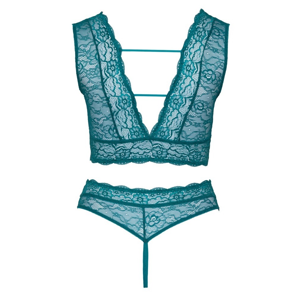 Reggiseno e perizoma senza cavallo di Cottelli CURVES in un irresistibile completo, interamente realizzato in morbido e delicato pizzo color blu petrolio. Il reggiseno presenta una profonda scollatura davanti e dietro ed è unito da elastici e eleganti anelli decorativi in oro rosa. Il perizoma a vita alta, senza cavallo, si distingue per la parte anteriore aperta e audace, sostenuta solo da anelli e fasce elastiche.