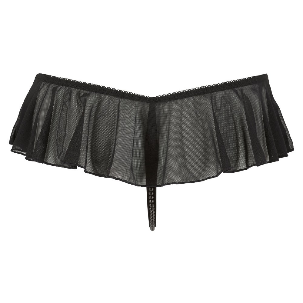 Un sensuale perizoma senza cavallo con volant che valorizzano la silhouette e una fila di perle nere nella zona del cavallo. La zona aperta del cavallo è seducentemente incorniciata da 2 fasce elastiche.