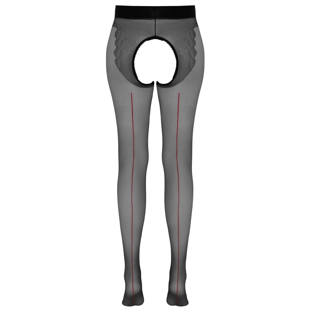 Collant aderenti senza cavallo, con punta rinforzata e zona perizoma integrata per un maggiore comfort. Si distinguono per l'elegante cucitura decorativa rossa lungo le gambe, che crea un contrasto seducente sul nero. L'apertura nella zona del cavallo aggiunge un tocco audace e funzionale.