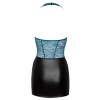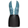 Abito corto aderente di Cottelli LINGERIE in due pezzi. La parte superiore è realizzata in fine pizzo verde acqua, mentre la parte della gonna è realizzata in un bellissimo materiale nero dall'aspetto opaco. Scollo profondo fino all'ombelico - 3 anelli color oro rosa e spalline elastiche tengono tutto insieme. Senza schienale, il collo a mezzaluna ha una chiusura a clip.