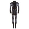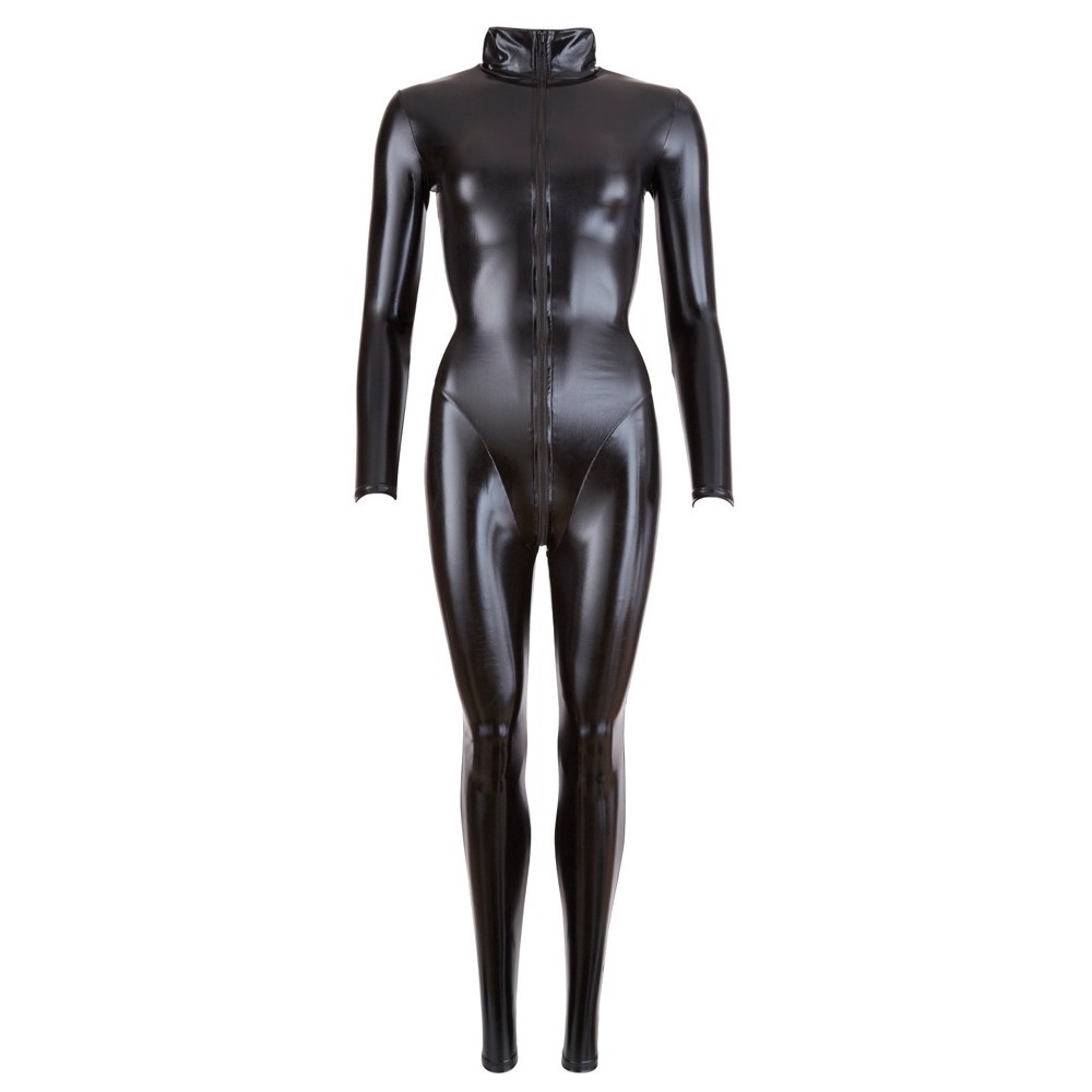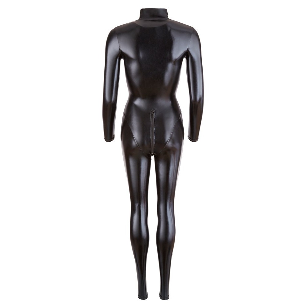Questa tuta nera, con maniche e gambe lunghe e collo alto, avvolge completamente il corpo senza perdere la sua sensualità. Il materiale elastico si adatta perfettamente, esaltando le curve in modo elegante. La larga cerniera a doppio cursore parte dal collo, scende lungo l'interno coscia e termina nella parte superiore dei glutei, consentendo una maggiore versatilità e un tocco audace.