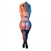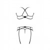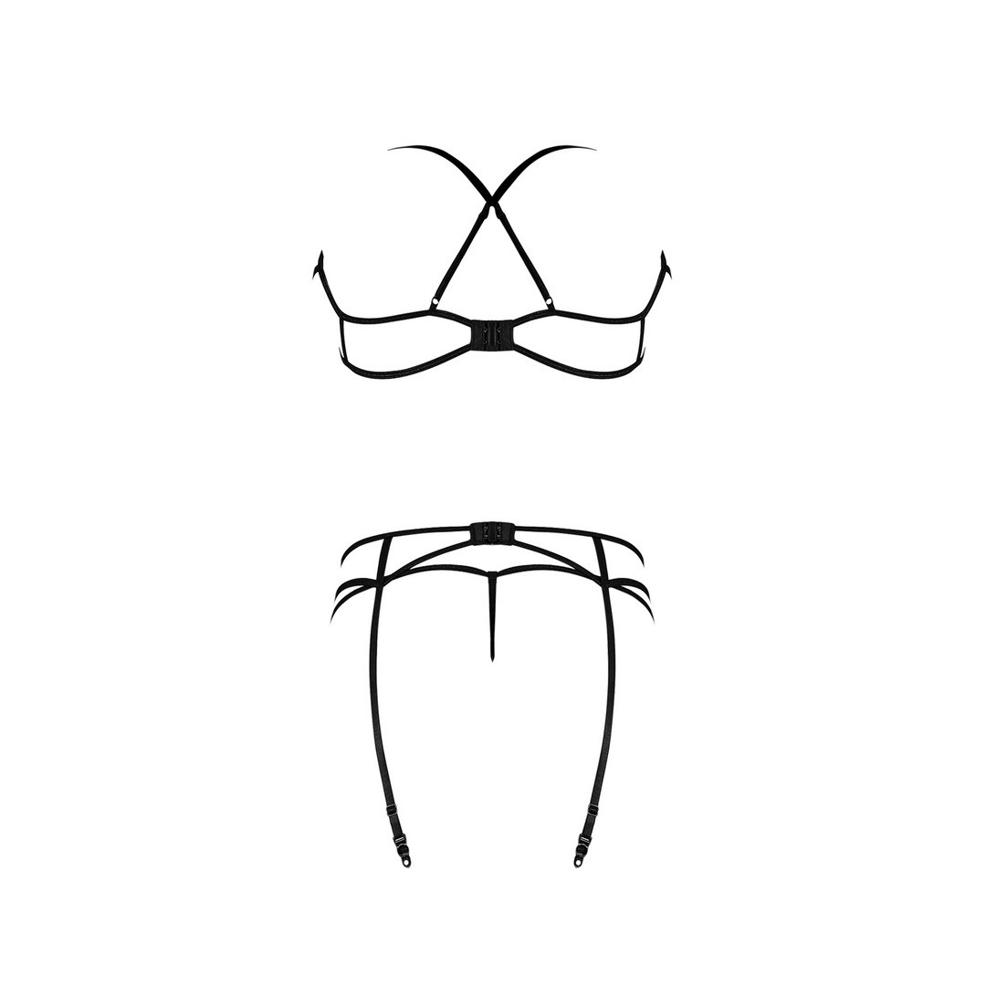 Della collezione Exposed by Magic Silk, questo completo comprende un reggiseno a spalline con cinturini regolabili che si incrociano sulla schiena, un anello decorativo a U sul davanti e chiusura con gancio sul retro, un reggicalze a cinturini abbinato con anello a U sul davanti, chiusura con gancio sul retro e cinturini regolabili con clip metalliche, e un perizoma classico in maglia.