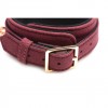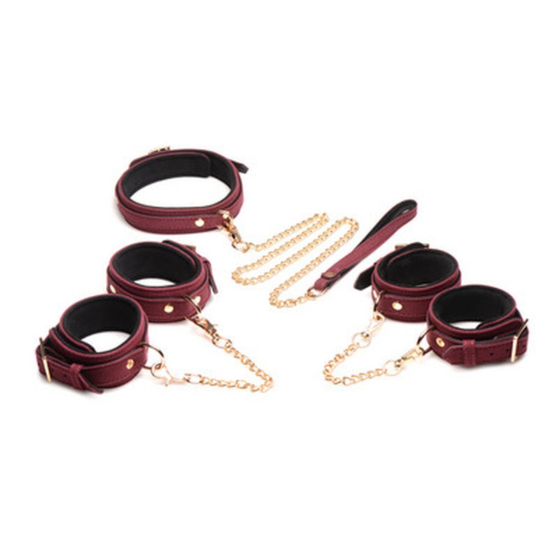 Set bondage in pelle scamosciata bordeaux e oro, con manette, collare, guinzaglio e catene regolabili.