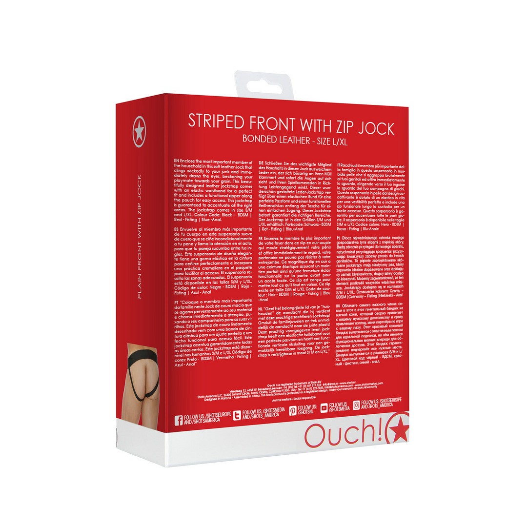 Attira tutti gli sguardi con il Jockstrap in pelle Ouch!, provocante, regolabile e con chiusura funzionale per un accesso rapido.