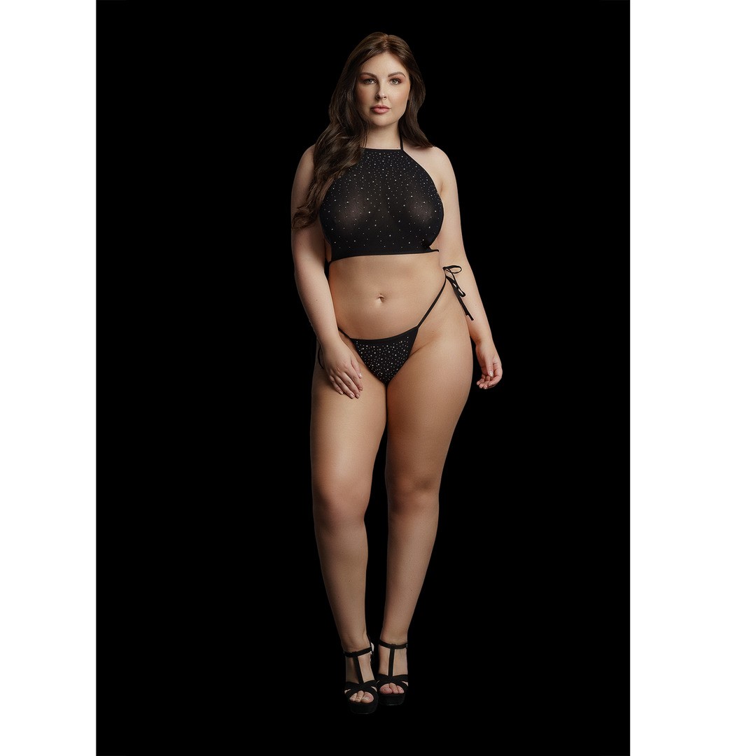Diventa il centro dell'attenzione con questo splendido completo ricoperto di brillantini e strass. Il top halter e lo perizoma con apertura sul cavallo elevano la sensualità a un nuovo livello. Questo sensuale completo, ideale per le taglie dalla 1XL alla 3XL, combina comfort e audacia in egual misura. Sentiti un vero miracolo di Natale con questo capo irresistibile.