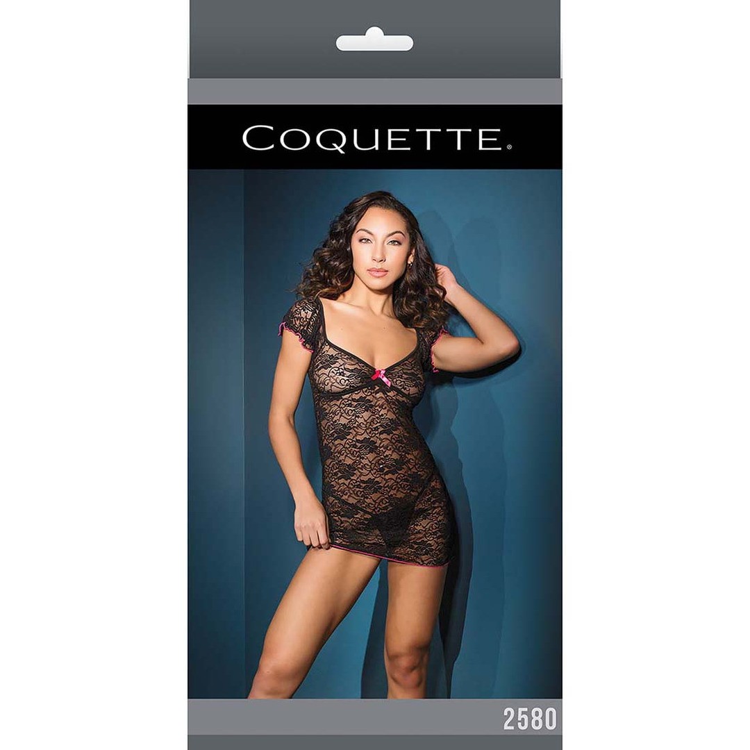 Abito rosa e nero in pizzo elasticizzato, con fiocco frontale, che unisce eleganza e comfort per tutte le occasioni.
