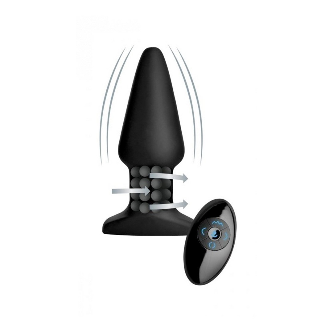 Plug anale con punta affusolata, comando, perle rotanti e vibrazione per una stimolazione intensa e un elevato piacere anale.