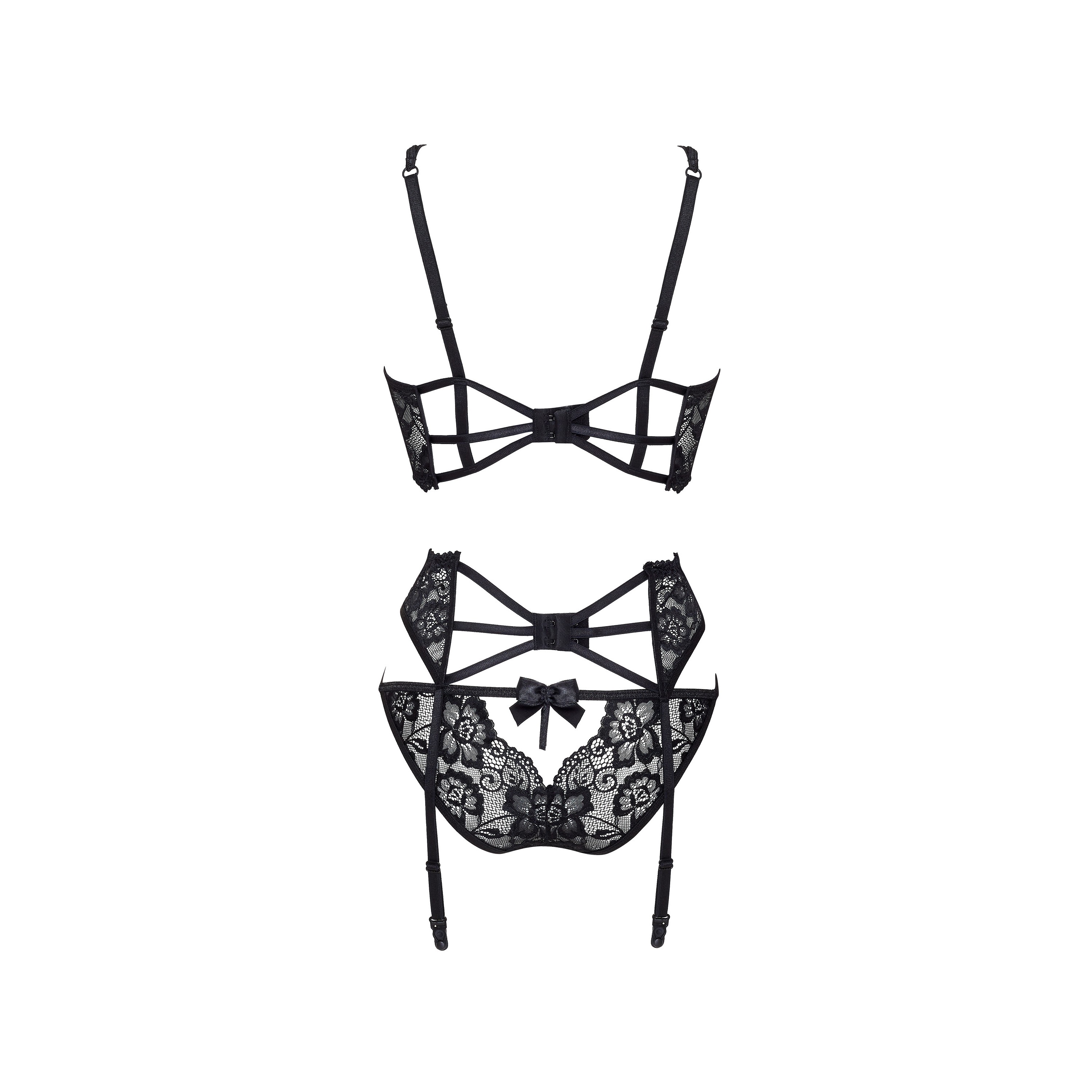 Sensuale set di lingerie a tre pezzi. Il reggiseno in splendido pizzo floreale ed elastico mette in risalto il seno grazie ai ferretti, mentre il delicato pizzo aggiunge un aspetto romantico.