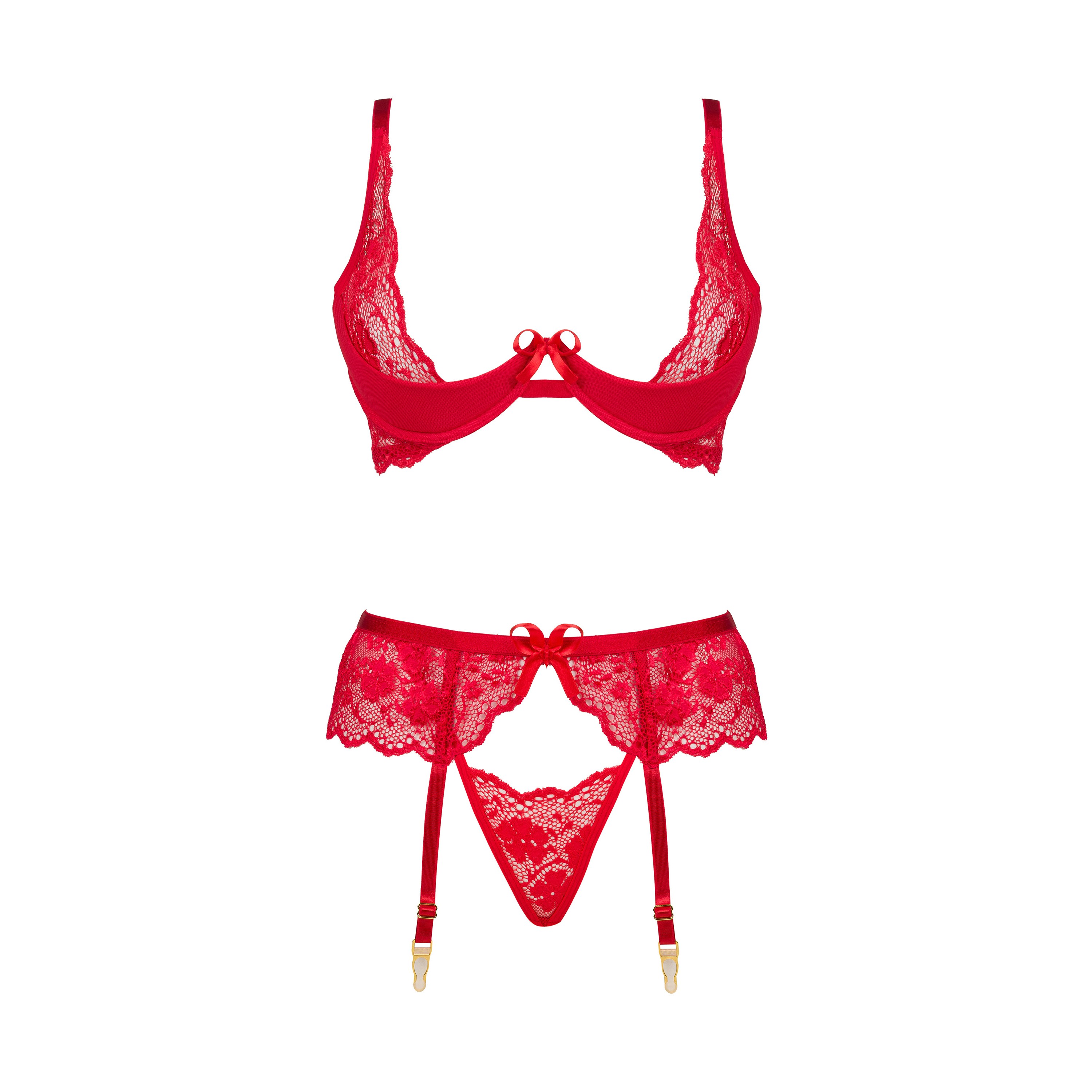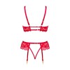 Set di lingerie classica in rosso, composto da reggiseno, mutandine e reggicalze.