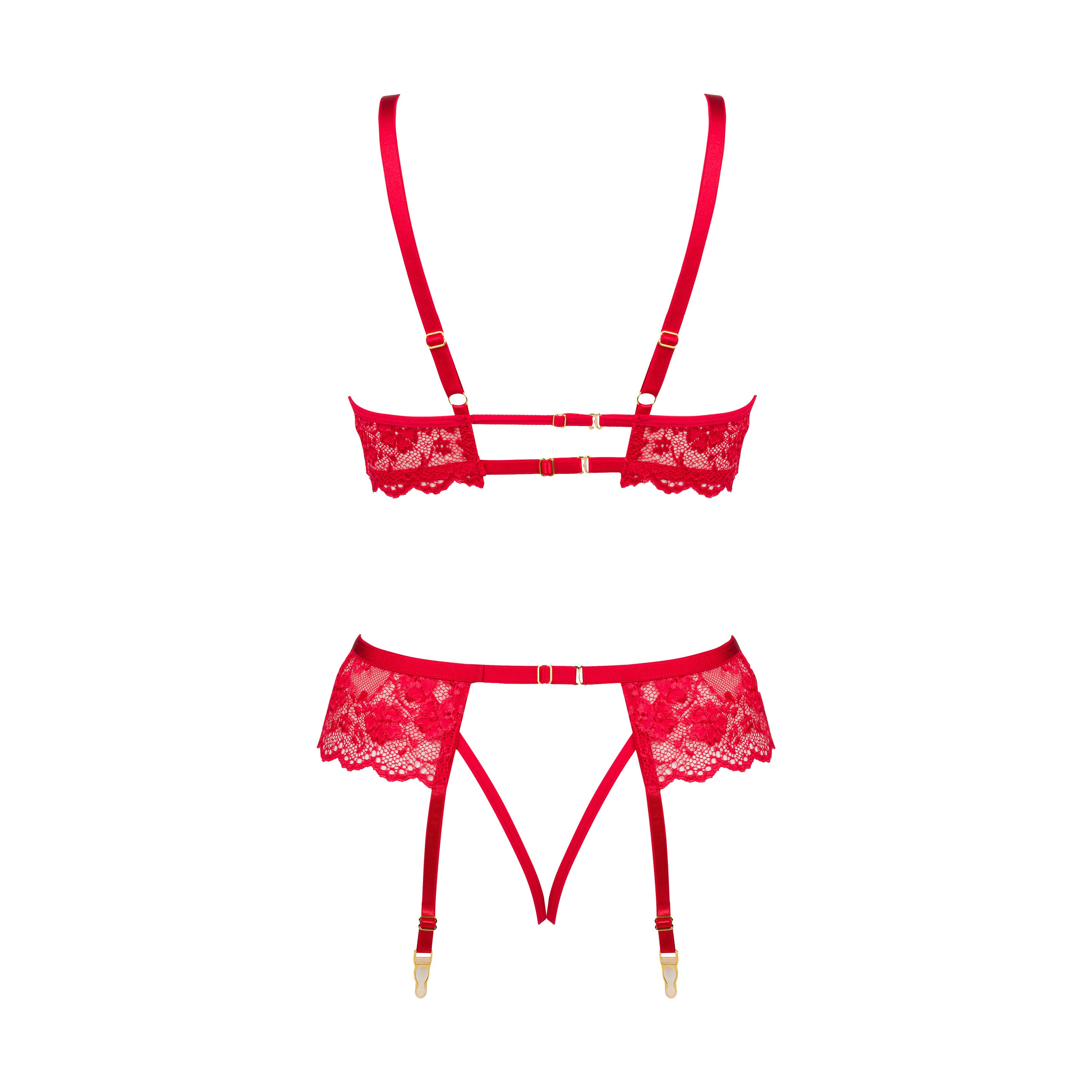 Rose Set Red incarna eleganza e raffinatezza. Il delicato pizzo che adorna il reggiseno e il perizoma si integra perfettamente con i materiali trasparenti e leggeri che abbracciano dolcemente il corpo. Questo set si adatta perfettamente alla silhouette, mettendo in risalto le sue caratteristiche nel modo più raffinato. Le spalline e le chiusure regolabili garantiscono una vestibilità e un comfort perfetti per essere indossati tutto il giorno e la notte.