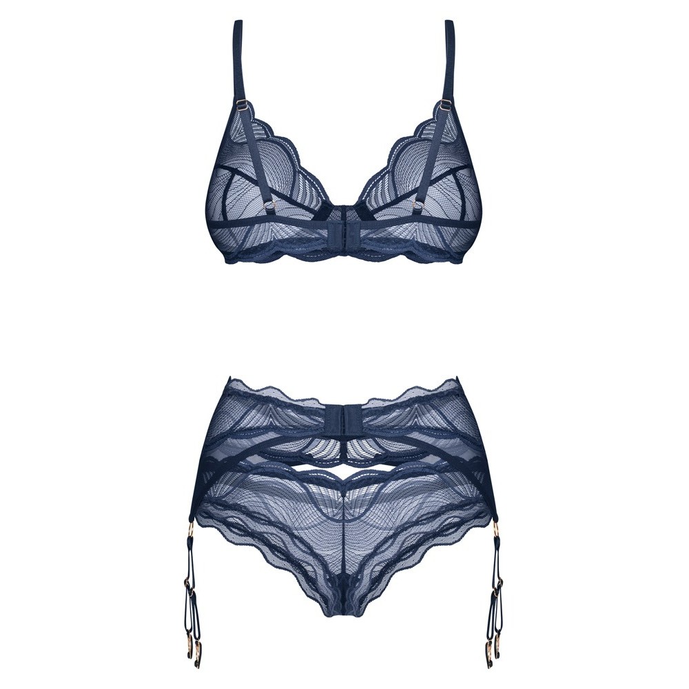 Il set trasparente Nightly Blue di Obsessive comprende un reggiseno con ferretto, un reggicalze e una stringa.