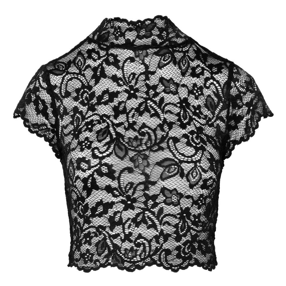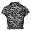 Il top corto di Noir è realizzato in un bellissimo pizzo floreale nero. È morbido ed elastico per una vestibilità molto comoda. Con collo alto e maniche corte. Ha uno spacco sul retro e una chiusura a gancio sul retro del collo.