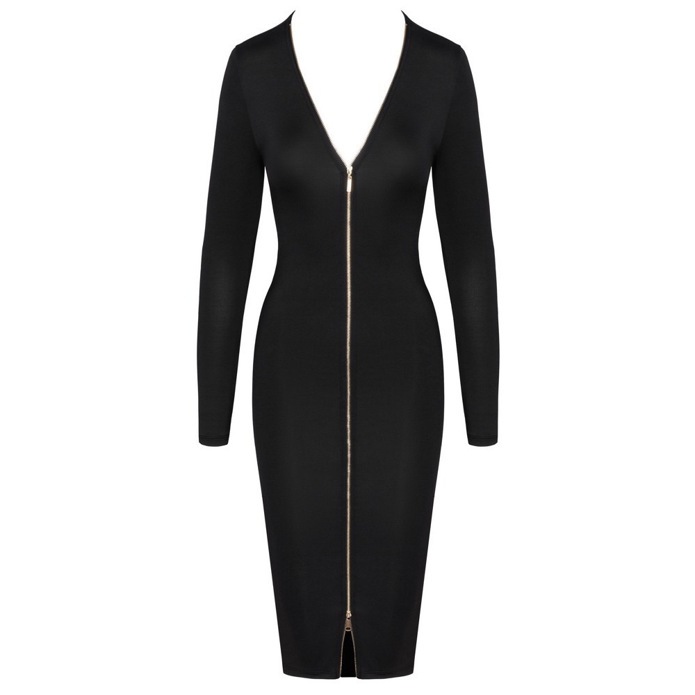 L'abito nero a maniche lunghe di Cottelli PARTY ha un design aderente, affusolato e lungo fino al ginocchio. Sul davanti è presente una cerniera a due vie color oro che può essere aperta dall'alto o dal basso. Il materiale delicato ma elasticizzato aderisce delicatamente al corpo, risultando molto comodo da indossare e da muoversi.