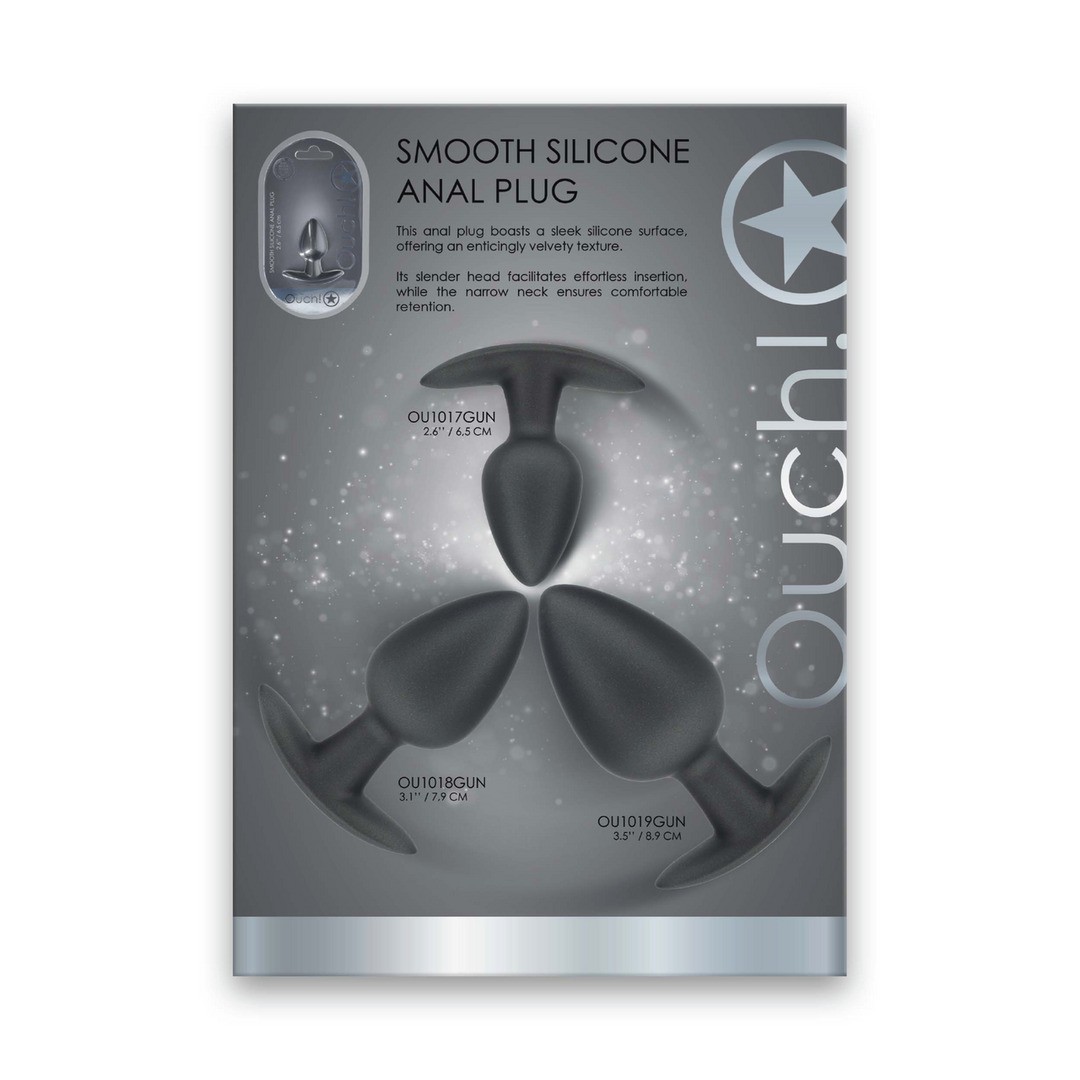 Infografica Smooth silicone anal plug (OU1017GUN - OU1018GUN - OU1019GUN) in inglese.