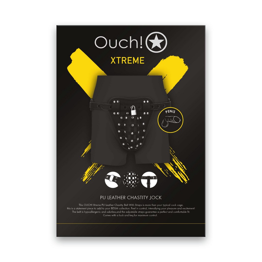 Infografica Pu Leather chastity jock (OU1032BLK) in inglese.