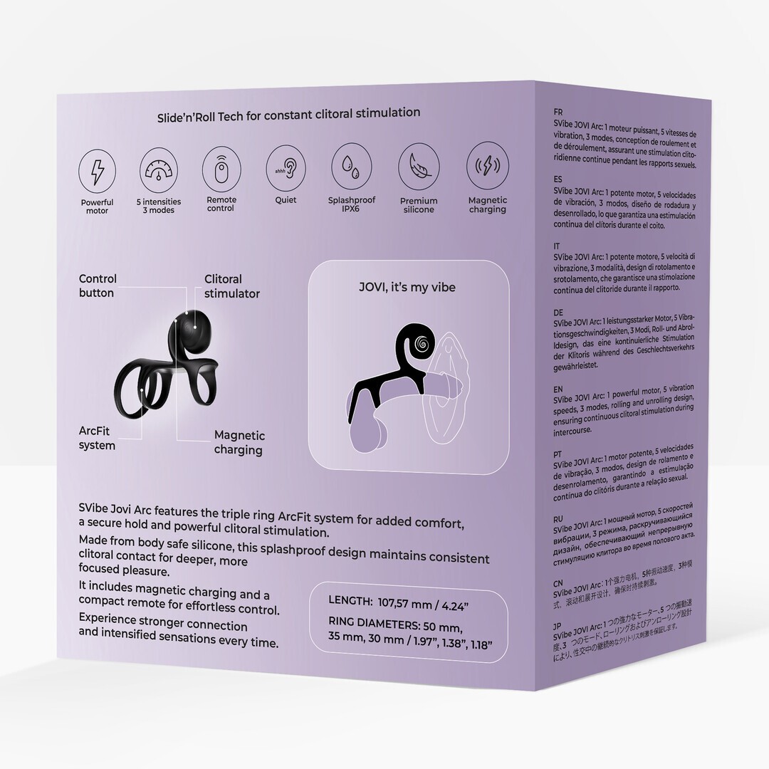 SVibe Jovi Arc è dotato del sistema ArcFit a triplo anello, che garantisce maggiore comfort, fissaggio sicuro e intensa stimolazione clitoridea. Realizzato in silicone sicuro per il corpo e resistente agli schizzi, mantiene un contatto costante con il clitoride, offrendo un piacere profondo e concentrato.
