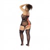 La maglia a rete trasparente con motivo di serpenti e rose si modella su ogni curva, incorniciata da elastici rossi a contrasto che catturano tutti gli sguardi. Una lunga e scenografica fibbia con lacci rossi sulla schiena scende elegantemente lungo la colonna vertebrale, lasciando un'impressione indimenticabile da ogni angolazione.