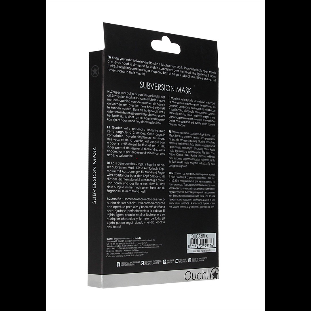Mantieni anonimo il tuo sottomesso con la maschera subversion. Questa comoda maschera si adatta perfettamente alla testa e si chiude facilmente sul retro grazie alla chiusura a cerniera. Inoltre, ha un'apertura nella zona degli occhi e della bocca. Questa maschera integrale e luminosa può essere indossata da lui o lei, e il tessuto sottile e leggero ti permette di respirare e sentire qualsiasi rumore, non importa quanto piccolo. Questa maschera ha la bocca e la zona degli occhi aperti, in modo da avere accesso alla bocca dell'utente e poi... usa la tua immaginazione.