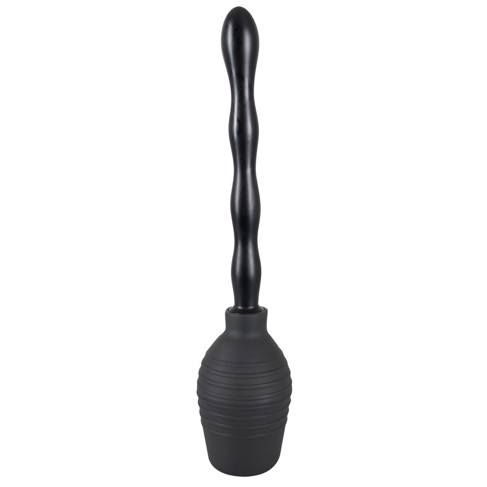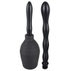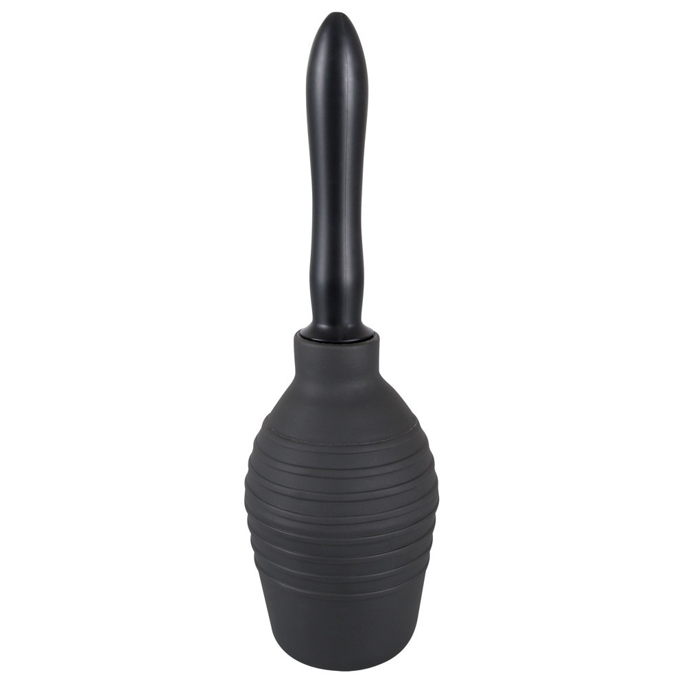 Ducha íntima preta (altura 13 cm, capacidade 300 ml) com dois acessórios de rosca intercambiáveis, ambos com bicos de pulverização. Fácil de limpar.