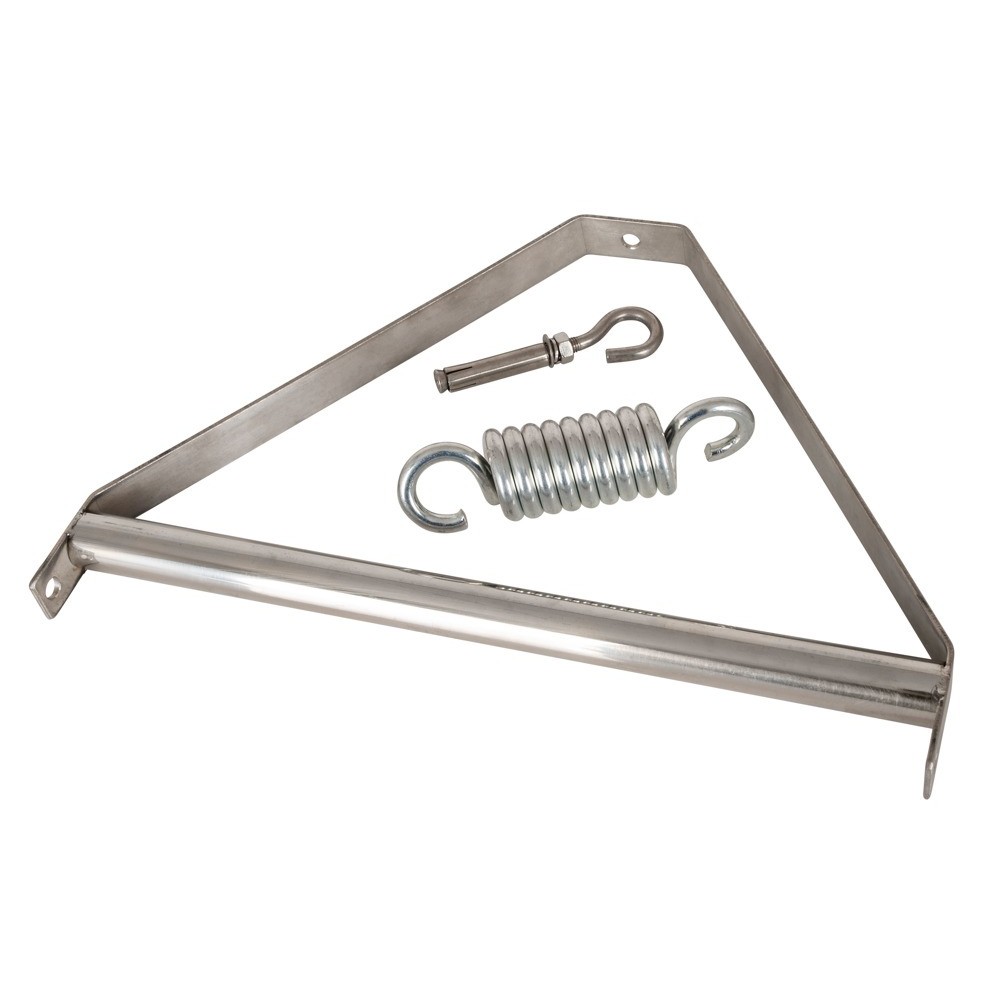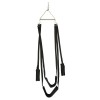 Baloiço sexual preto composto por duas alças ajustáveis para o corpo e duas alças curtas para as pernas. As alças estão fixas a uma barra de suspensão metálica robusta com mola. Todos os anéis possuem acolchoamento macio para maior conforto.