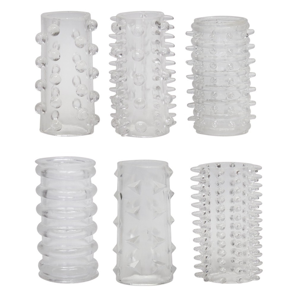 O sexo com estas mangas transparentes para o pénis torna-se seis vezes mais excitante e gratificante do que nunca. Ajudam a prolongar o prazer enquanto ela desfruta das texturas estimulantes. Cada manga é feita de um material supermacio e flexível, semelhante ao silicone, que se adapta perfeitamente ao pénis. As numerosas saliências e relevos internos intensificam a estimulação, conduzindo ambos ao clímax.