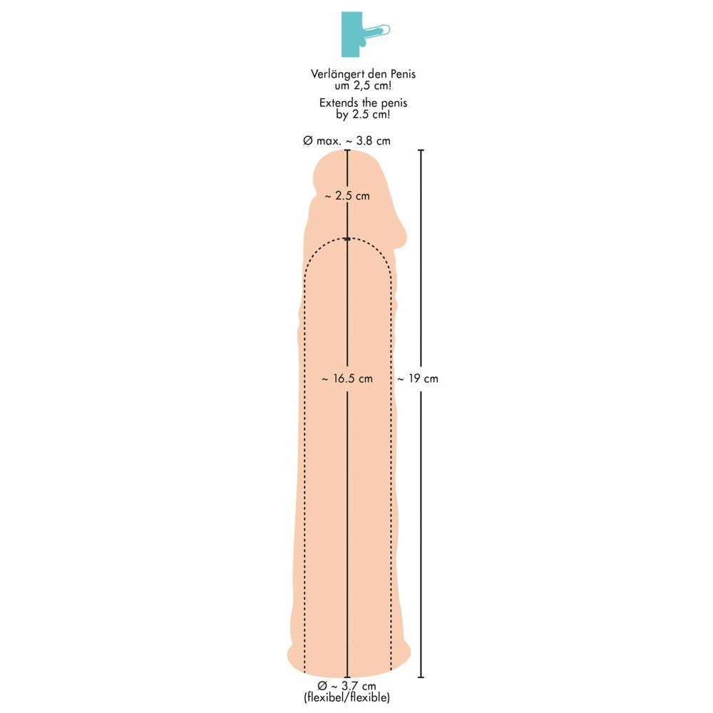 Manga extensora para o pénis fabricada em material ultra macio, concebida para aumentar o comprimento em cerca de 2,5 cm. Possui glande definida e veias salientes, com interior aveludado e suave para maior conforto. O extensor é agradavelmente flexível e elástico, adaptando-se facilmente ao pénis e aos movimentos.