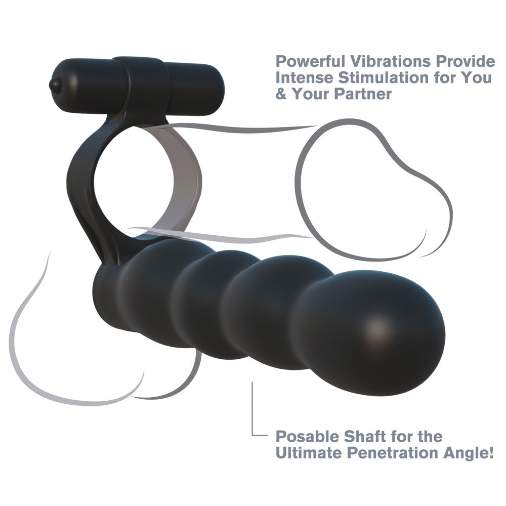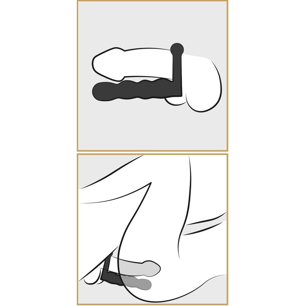 Anel para o pénis de encaixe seguro com bala vibratória inserível e contas anais integradas. O anel é colocado sobre o pénis, permitindo-lhe desfrutar de um efeito de pénis duplo, combinado com um estimulador de clitóris vibratório para uma estimulação tripla intensa. O anel para o pénis ajuda ainda a manter a ereção de forma eficaz, graças ao efeito de congestão sanguínea. A pequena e potente bala vibratória é inserida no anel superior, oferecendo uma estimulação adicional e emocionante. A bala vibratória é à prova de água, podendo ser utilizada no banho ou no duche.