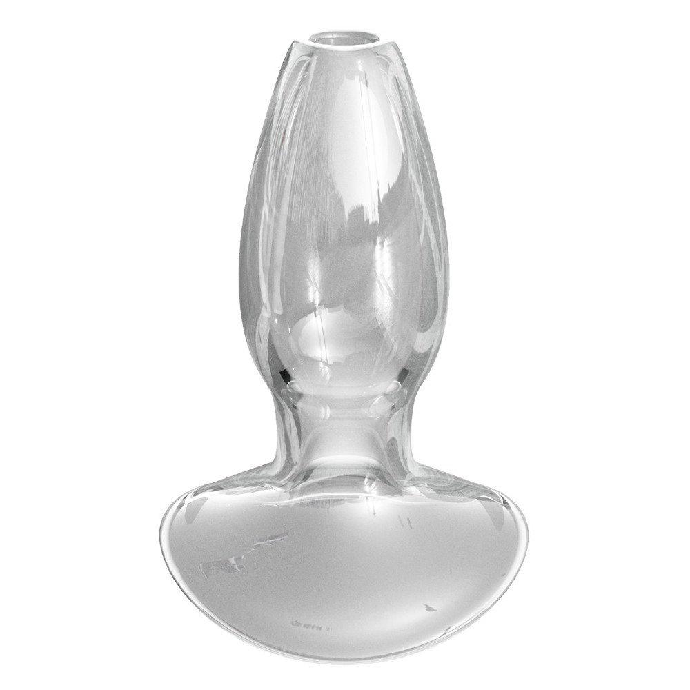 Plug anal oco com base de segurança que impede a inserção excessiva. Perfeito para enemas refrescantes e jogos sensoriais com um mini vibrador. Apresenta um design exclusivo e transparente em vidro de borossilicato, resistente e higiénico.