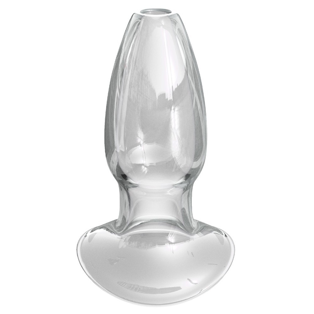 Plug anal oco com base de segurança que impede a inserção excessiva. Perfeito para enemas refrescantes e jogos sensoriais com um mini vibrador. Apresenta um design exclusivo e transparente em vidro de borossilicato, resistente e higiénico.