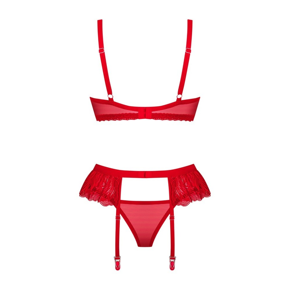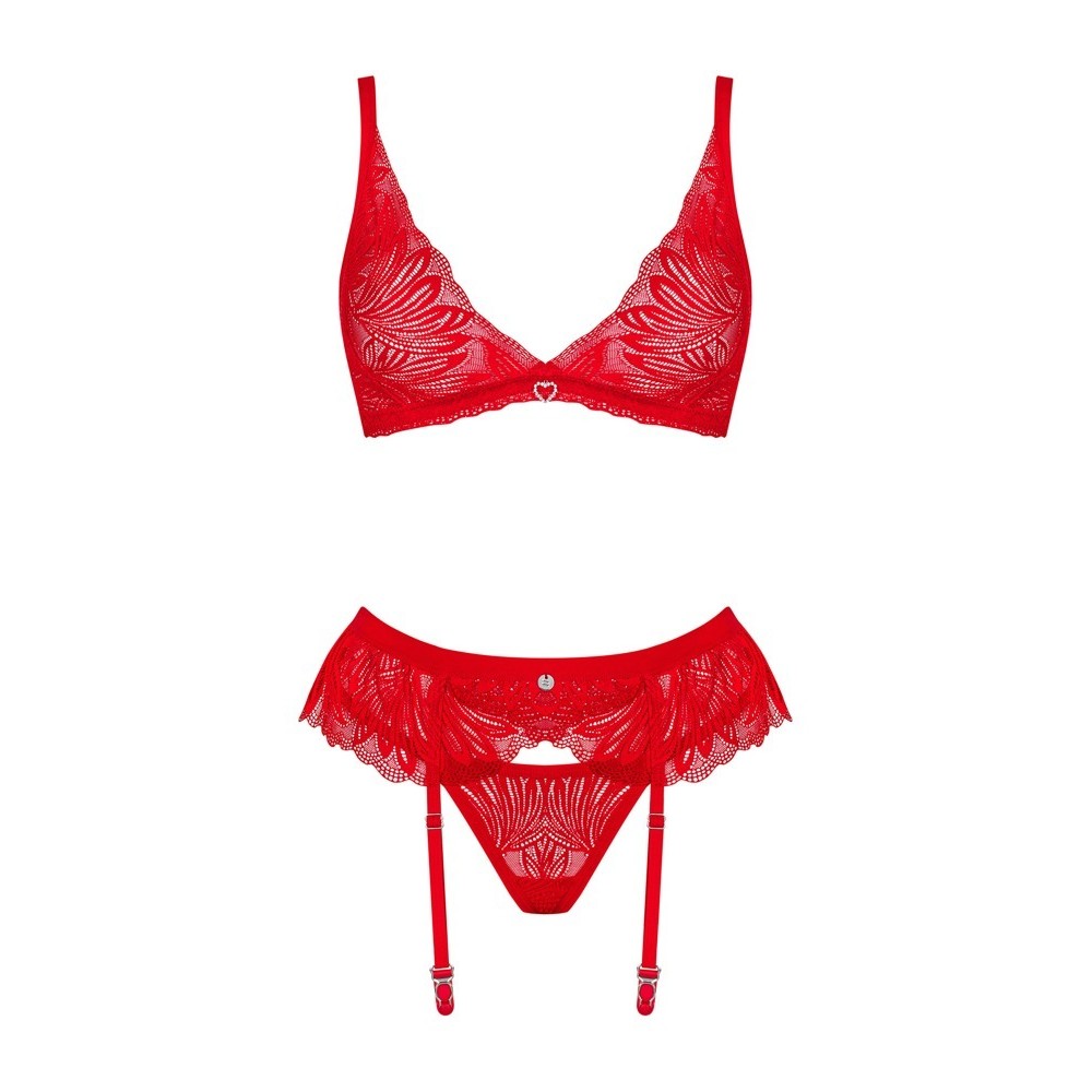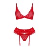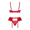 O delicado conjunto Chilisa da Obsessive é composto por um sutiã, um cinto de ligas e uma tanga em renda floral fina.