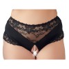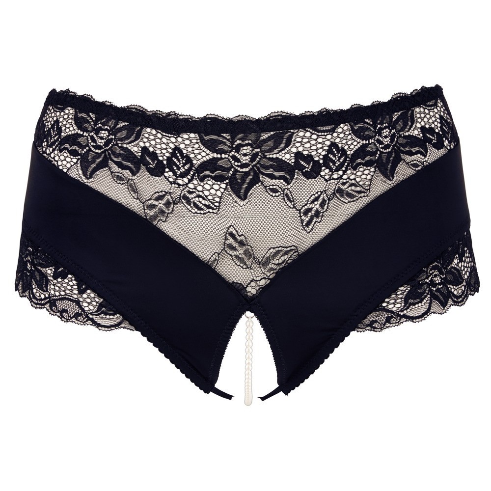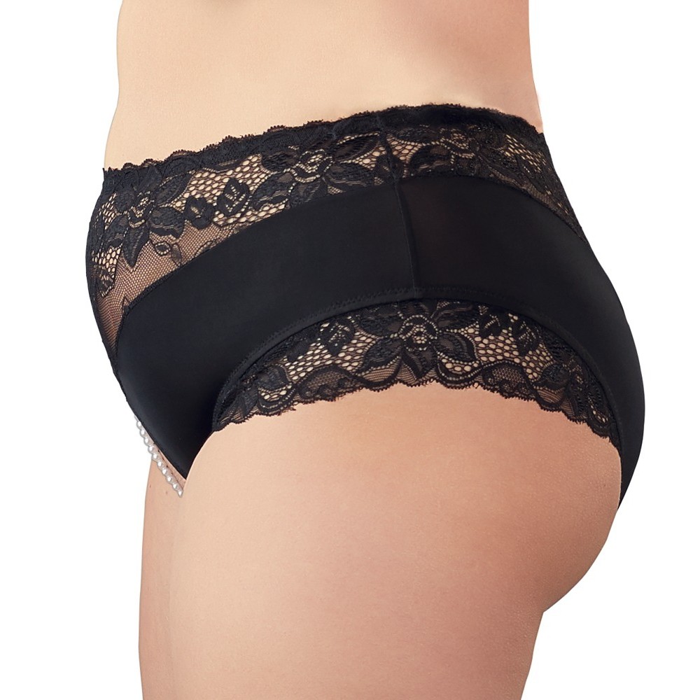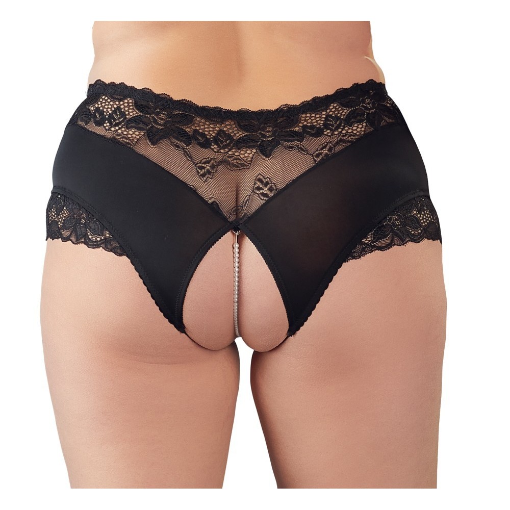 Cuecas pretas até à cintura com uma delicada inserção de renda. Há uma fila elástica de pérolas sobre a zona aberta das virilhas que estimula o clitóris sempre que se move! 95% poliéster, 5% spandex. Renda: 90% poliamida, 10% spandex.