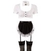 Conjunto completo para um serviço sexy, incluindo top curto, tanga com ligas sem virilha, meias, avental, bandolete e gargantilha estilo colarinho.