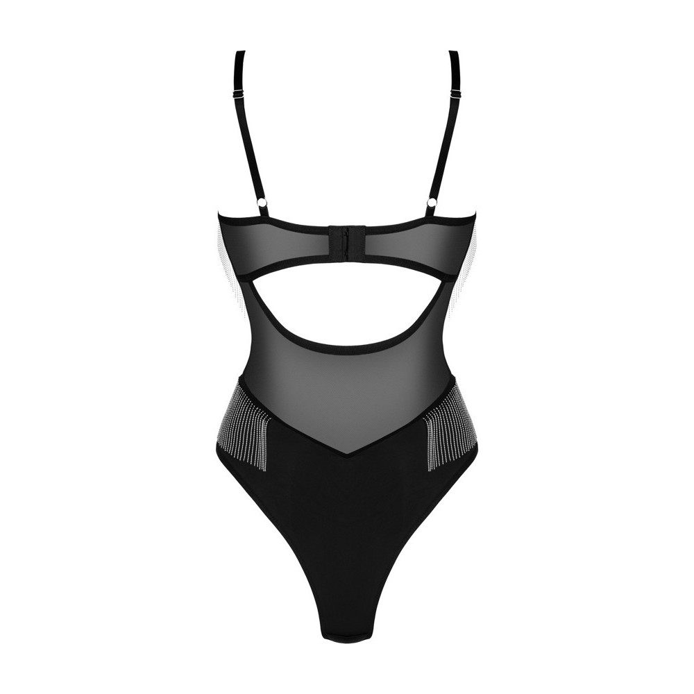 O body Milladis é uma proposta para mulheres confiantes que adoram lingerie sensual e original. O sutiã com aros valoriza os seios e o decote, enquanto delicadas filas de missangas prateadas sob o busto adicionam um toque de glamour. A malha ligeiramente translúcida desperta a imaginação. Inclui alças ajustáveis, fecho confortável nas costas e fecho regulável entre as pernas, oferecendo conforto e um ajuste perfeito.