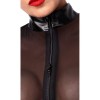 Body preto de mangas compridas da Noir, numa combinação sofisticada de powernet transparente na parte superior e tecido mate na restante zona, que proporciona um efeito acolhedor. Macio e elástico, garante um elevado conforto. O fecho de correr prolonga-se da gola alta até às virilhas, passando pela zona inferior. Duas grandes argolas na frente, à altura do peito, destacam-se de forma ousada e insinuam um efeito de piercings excitantes nos mamilos.