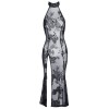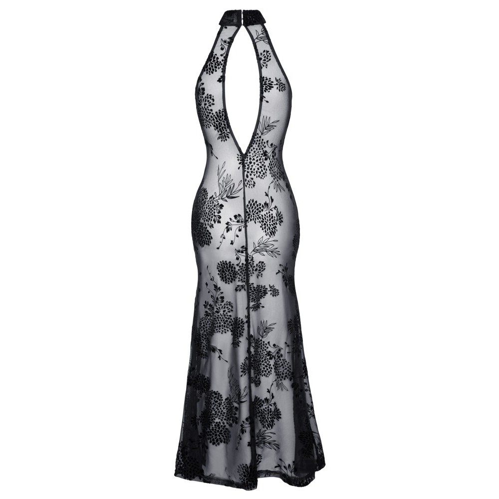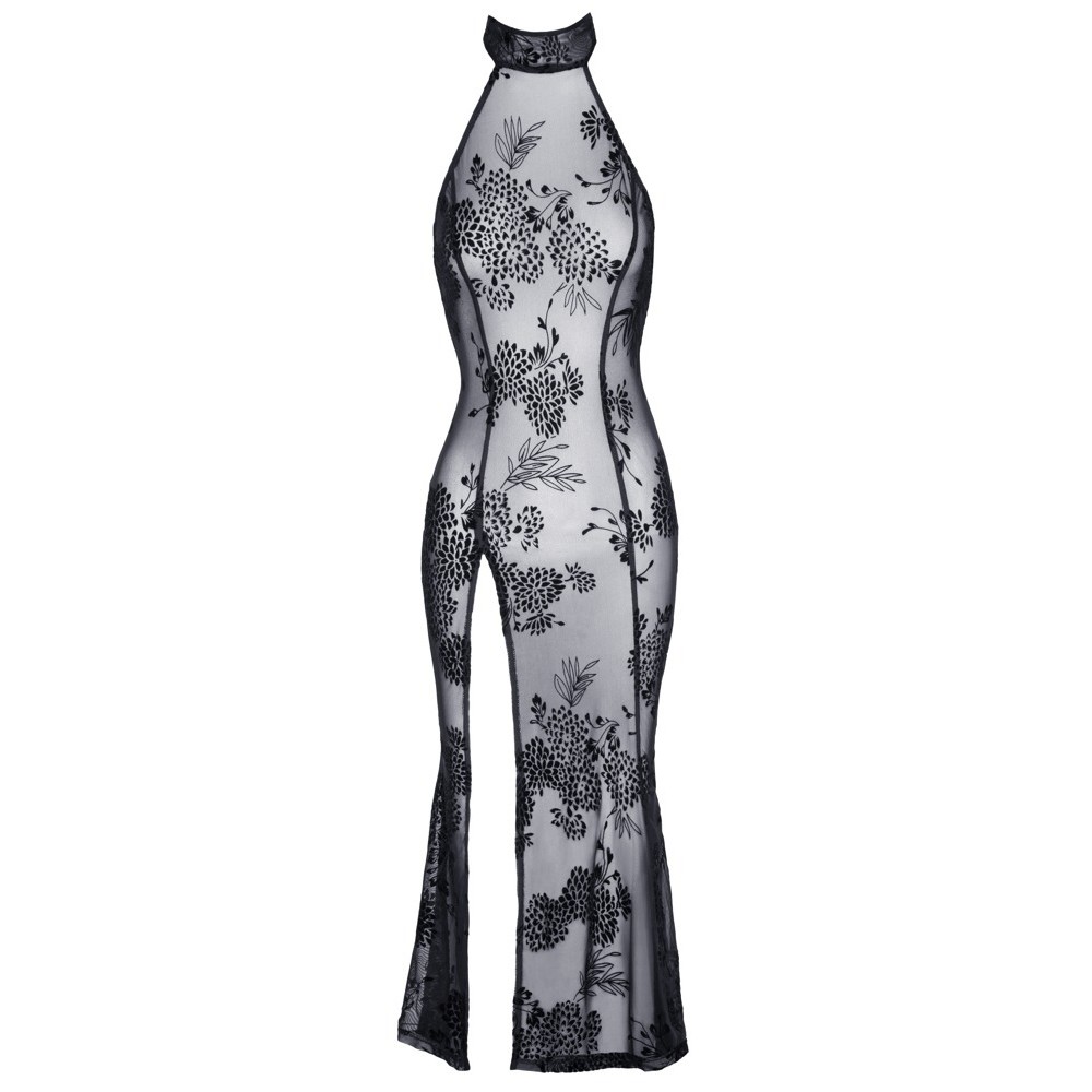 Vestido comprido sem mangas da Noir, inteiramente confeccionado em powernet elástico, coberto por um delicado estampado em veludo flocado com padrão floral. O modelo é justo, com uma fenda alta frontal na perna, gola alta fechada com um botão atrás e um elegante recorte oval nas costas.