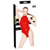 Corpo da Black Level totalmente em vinil vermelho brilhante e luminoso. Justo ao corpo, com pernas altas, possui um fecho de correr acolchoado de duas vias na frente, que começa na gola alta, percorre a zona das virilhas e termina no topo das nádegas. O fecho de duas vias permite abrir rapidamente ambas as extremidades.