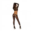 Conjunto de duas peças em rede com padrão zebra e alças ajustáveis. Inclui soutien de manga comprida com luvas de dedos incorporadas, gola alta estilo tartaruga e design curto com detalhe de anel e alça decorativa. Leggings sem pés em rede zebra a condizer, com o mesmo anel metálico e detalhe elástico. Tanga não incluído. Um conjunto ousado e moderno, ideal para quem procura uma lingerie sensual e distinta.