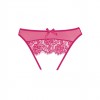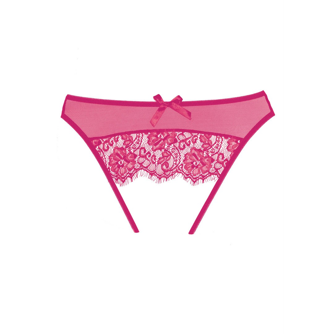 Desejos ocultos revelados nesta cuequinha transparente com abertura na virilha, aparentemente secreta, com renda de pestanas a acariciar o traseiro aberto. O facto de ser rematada com um laço é um toque de doçura, salpicado sobre um sopro de malícia.