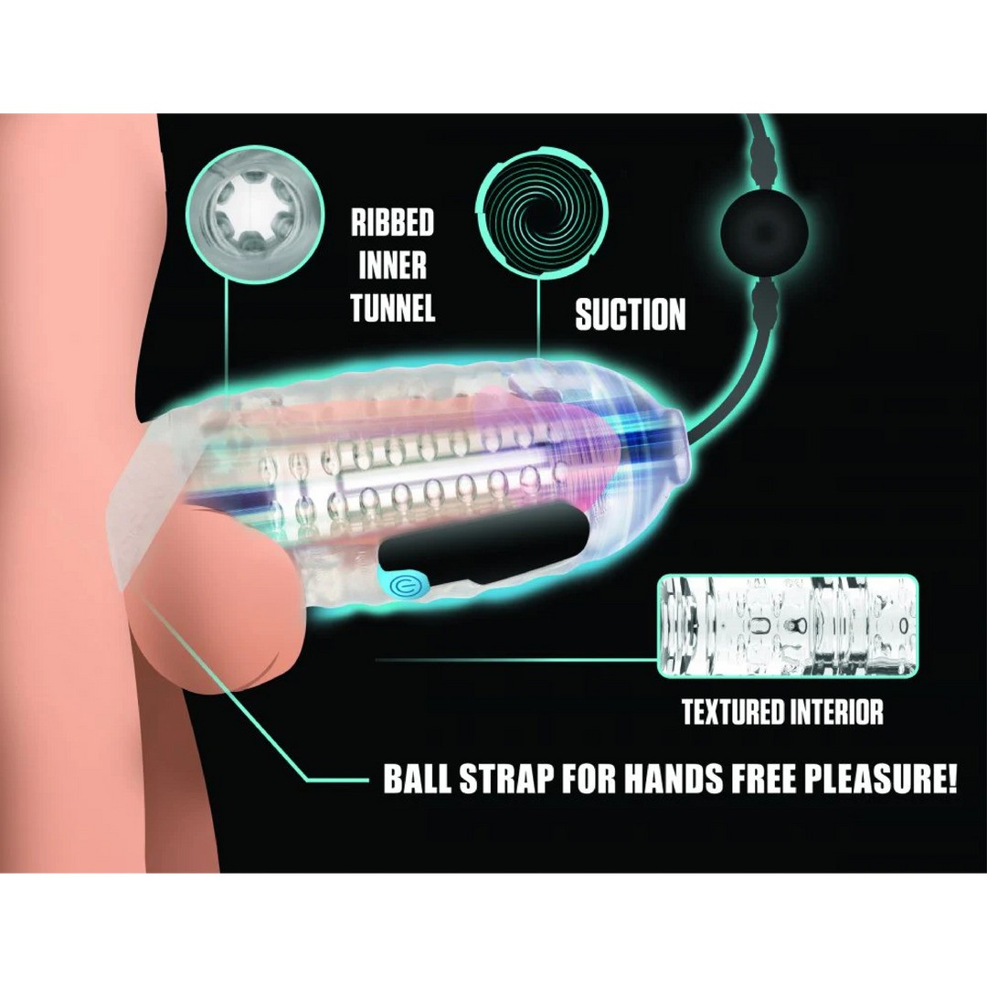Basta aplicar um pouco de lubrificante à base de água, colocar a manga transparente e elástica em TPE sobre o pénis e ajustar a tira de fixação para os testículos, que a mantém confortavelmente no lugar. Ligue o tubo à parte superior da manga e insira o bullet vibratório no bolso lateral da mesma. Em seguida, desfrute de uma estimulação completa através da sucção e vibração, controladas pelo mini comando portátil.