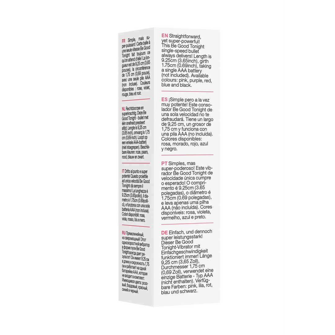 Simples, mas incrivelmente poderosa! A bala vibratória Be Good Tonight é sinónimo de prazer imediato e eficaz. O seu design compacto e velocidade única garantem uma estimulação intensa e precisa sempre que desejar.